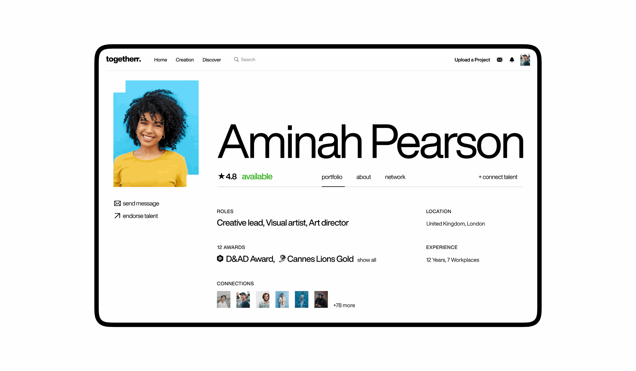Working closely with the product team, while the brand identity was already established, the product UI expanded it further through bold typography, bright colour accents, and striking talent photography — making the platform feel confident, modern and recognisable.